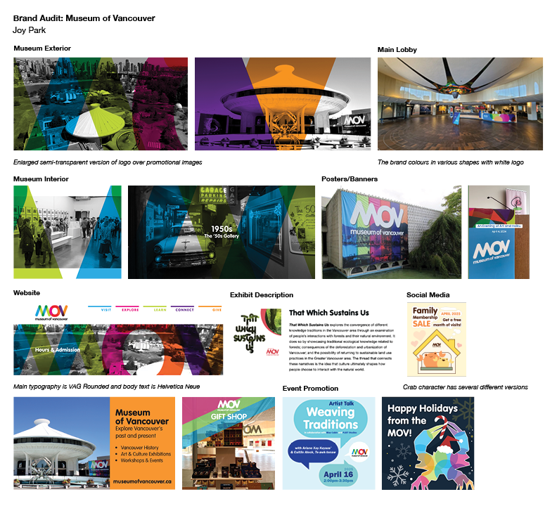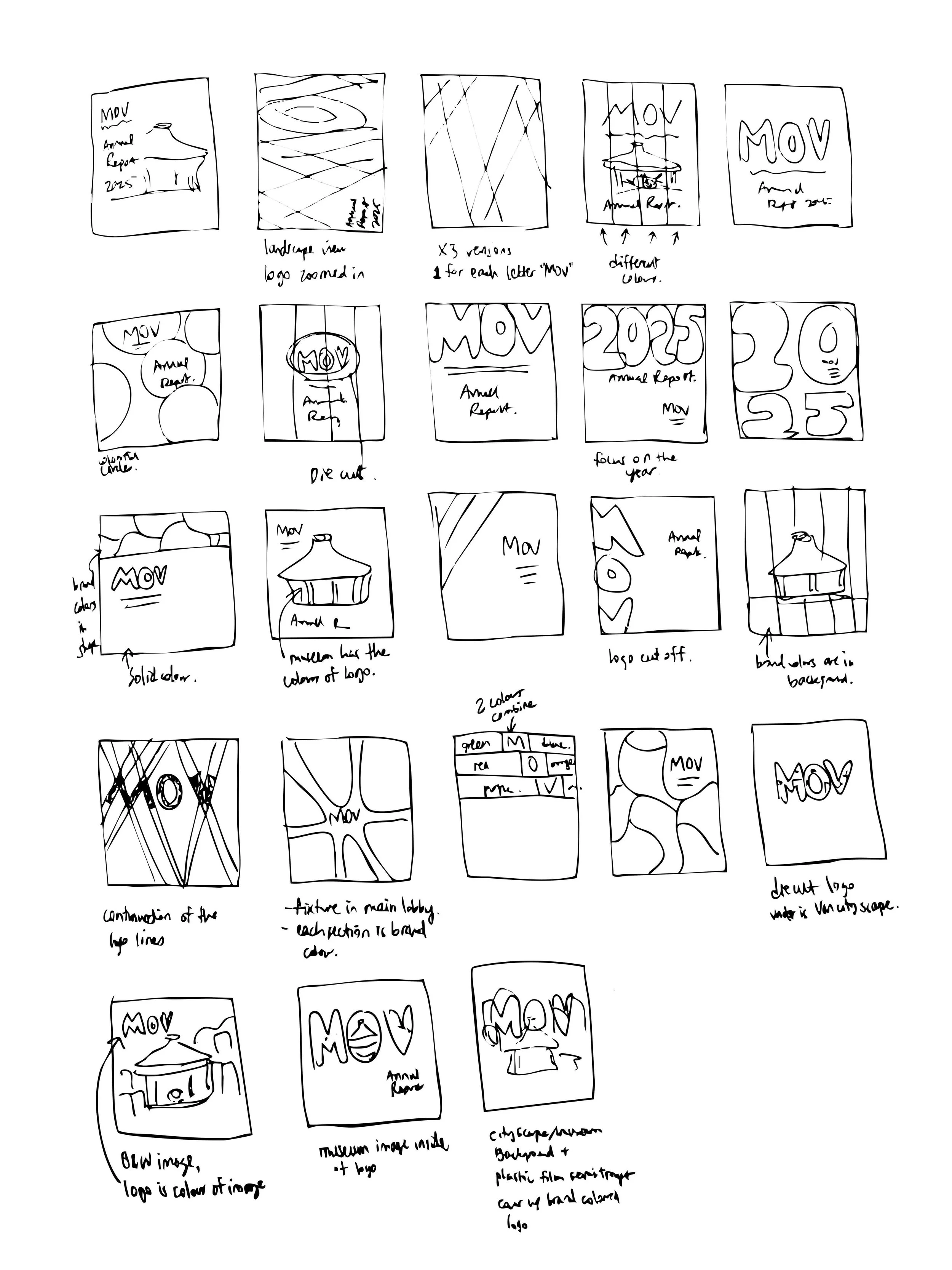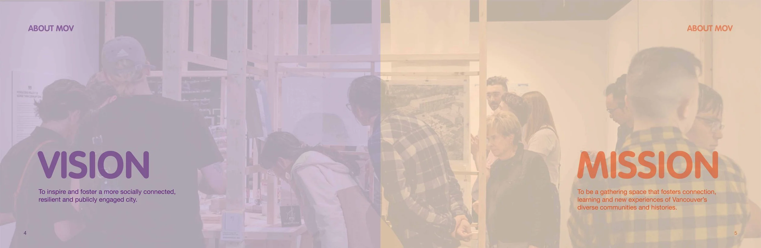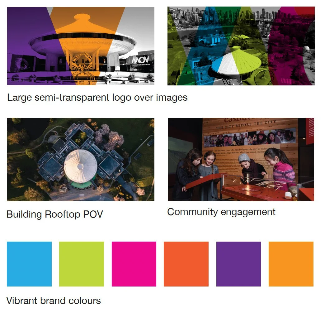 The chosen concept’s cover has the semi-transparent background with the cityscape encased in the logo, it shows how MOV brings vibrancy to the city’s history and creates new opportunities to experience Vancouver’s diverse community. Notice the “O” in MOV is the building rooftop, this is an element I use throughout the report, making a memorable icon and bringing some fun to the project.
