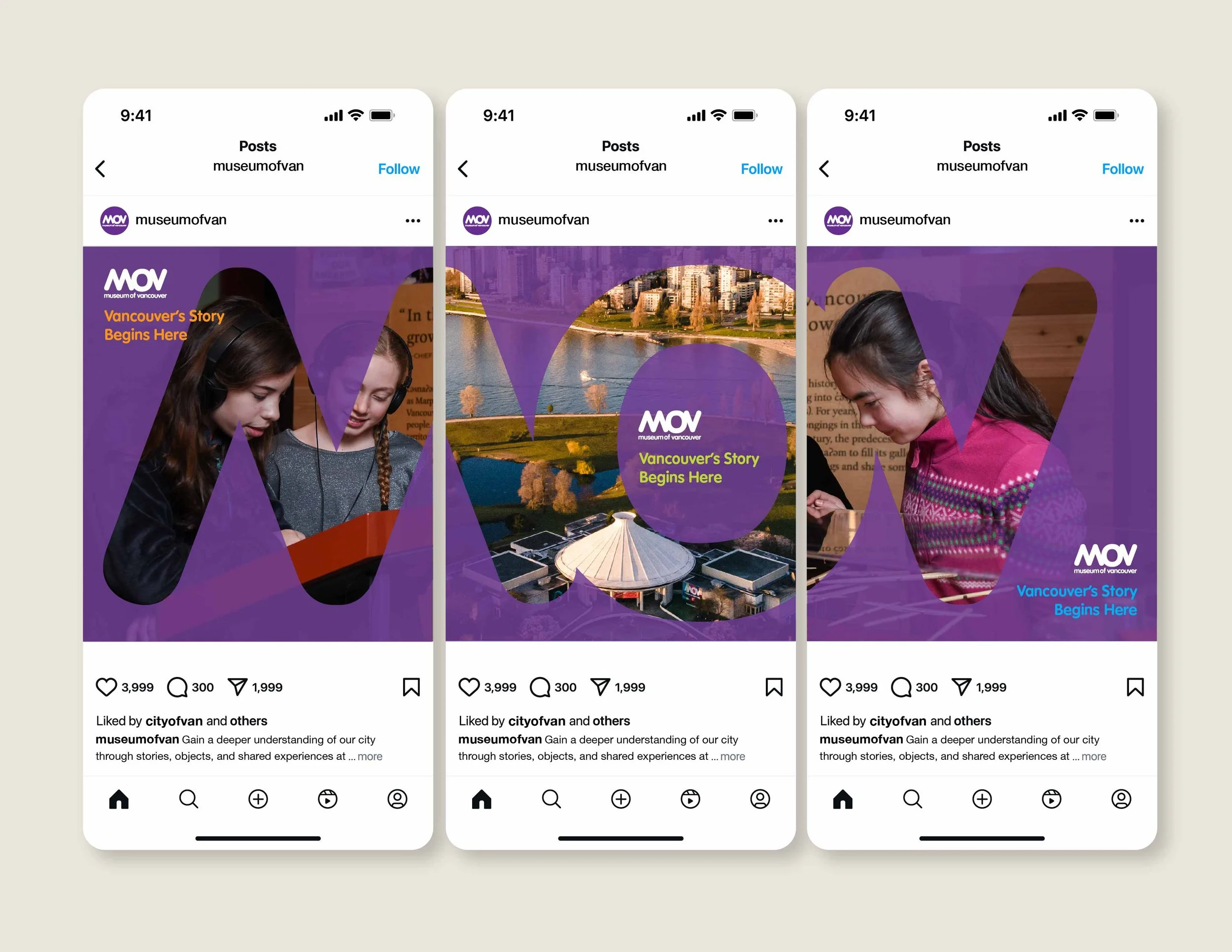 3-in-1 posts/stories that connect to make the letters “MOV”. Each post separately still promotes the museum and brand